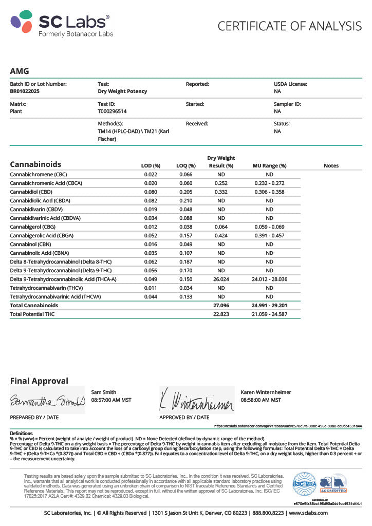 AMG is a 70% sativa and 30% indica weed strain made from a genetic cross between Amnesia Haze and Biker OG. This strain is a citrusy and stimulating hybrid that offers a cerebral and energetic high. AMG has a lemony and herbal aroma with hints of diesel and spice. The buds are fluffy and frosty, with neon green and orange hues. AMG is 26% THC, making this strain an ideal choice for experienced cannabis consumers. Effects include euphoric, happy, and energetic. People often choose AMG when dealing with symptoms associated with stress, depression, and hypertension. Bred by Pearl Pharma, AMG features flavors like spicy/herbal, orange, and tropical.